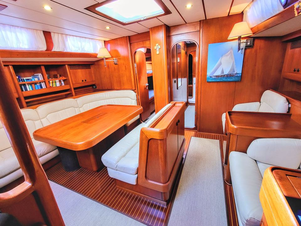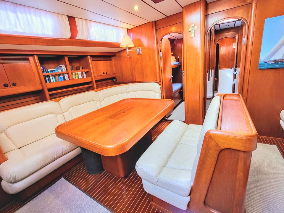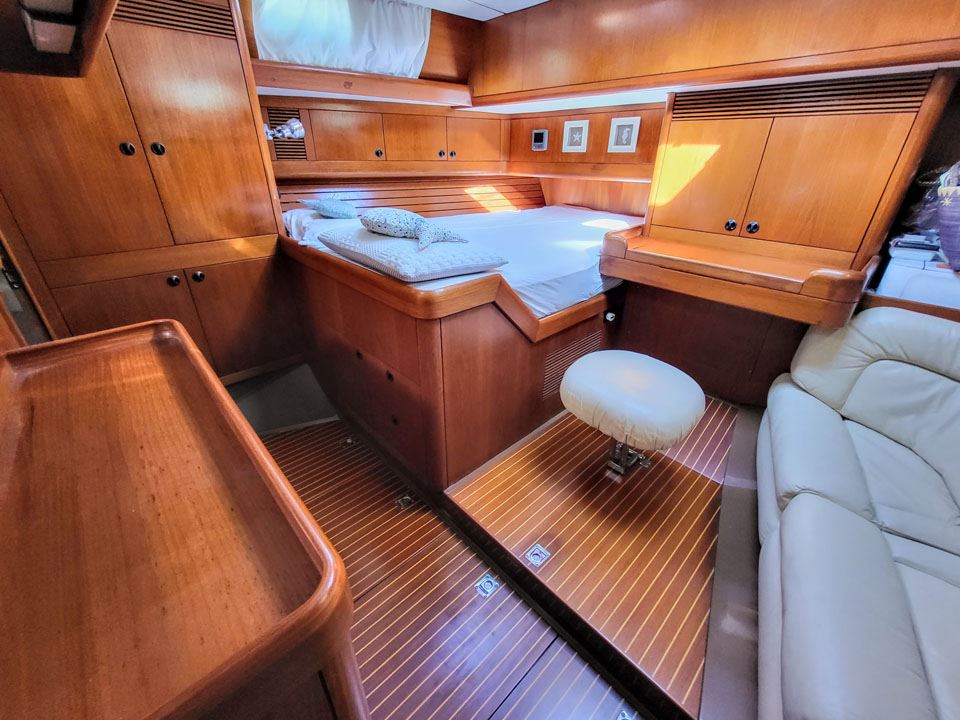 Nautor Swan 55, GEMM’s interior offers an owner’s cabin with double berth and sofa, two guest cabins – sharing one toilet / shower compartment and a fourth double (crew) cabin in the bow.