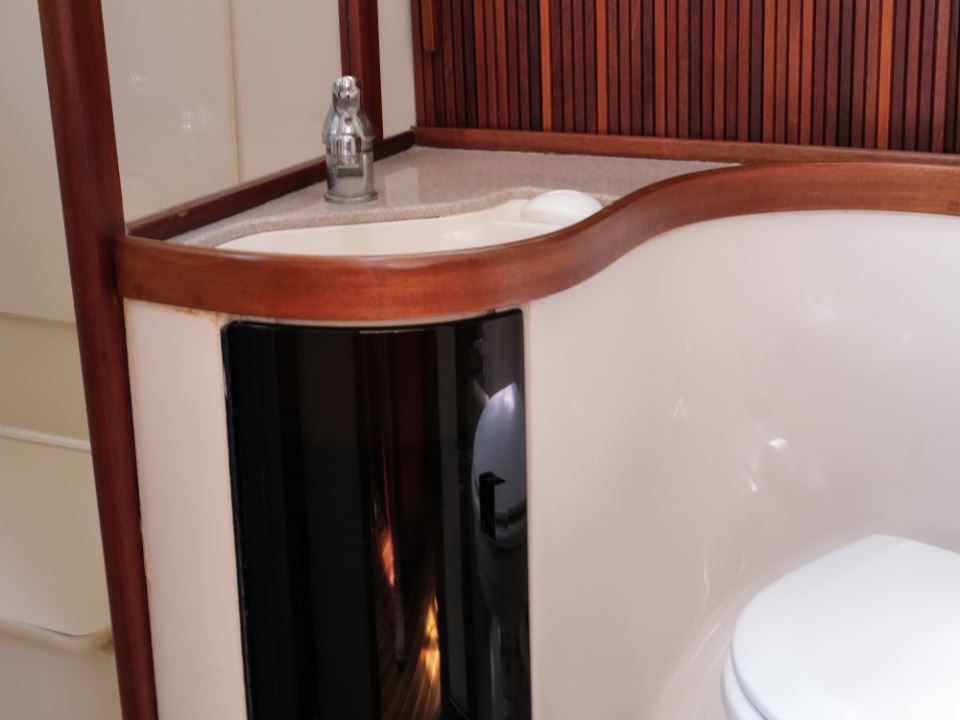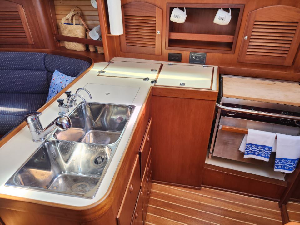 The galley is L-shaped and includes a large top-loading refrigerator, a two-burner stove with oven, and deep double sinks. Opposite the galley is a spacious head with stall shower. Electronics are by Raymarine and include a plotter, radar, sailing instruments, and autopilot, along with an Icom VHF and a stereo.
