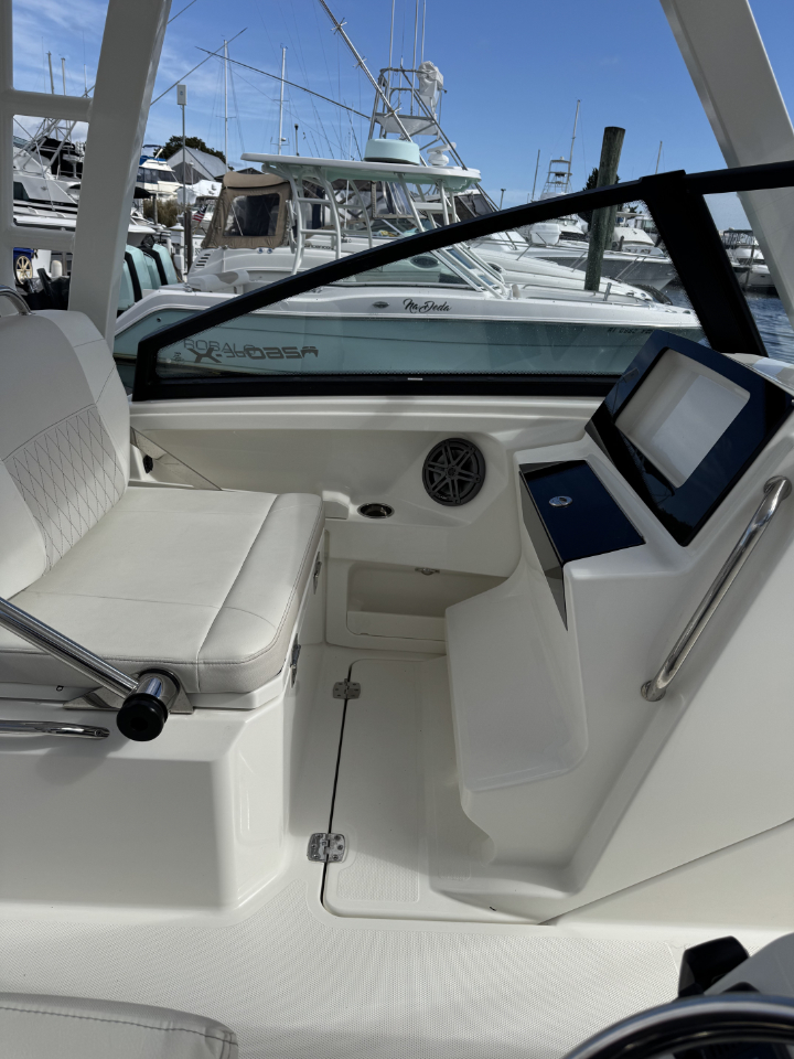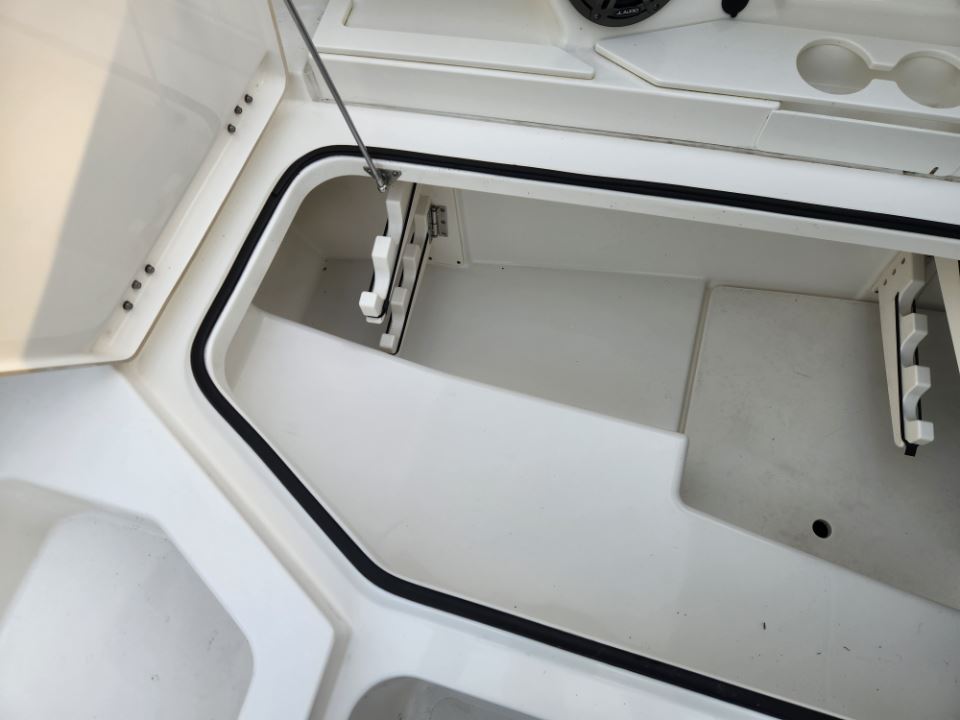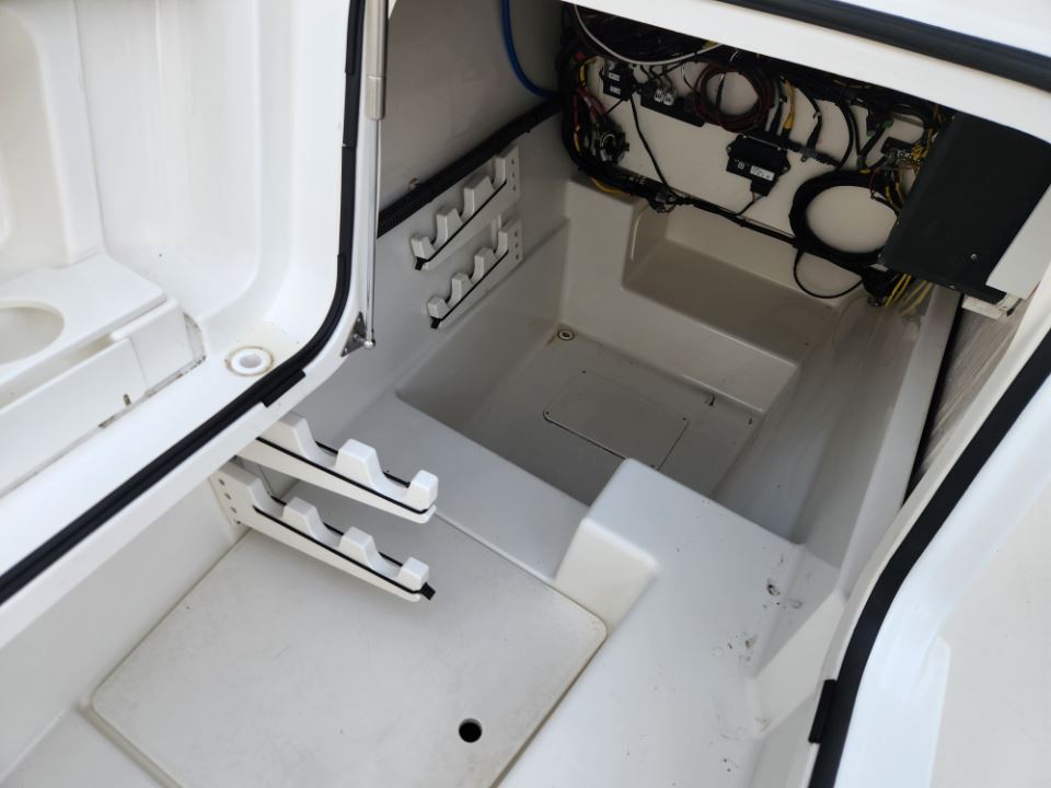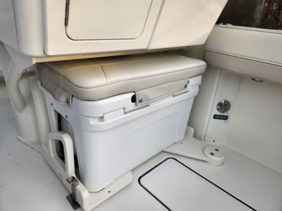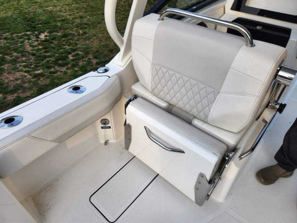The cockpit is protected by a wraparound windscreen and a solidly built rigid hardtop with rod holders at the rear. There are multiple storage lockers, a live well, and a clever swing-out cooler that provides additional seating or a step when in use, and stows beneath the helm seat when not. The port helm-seat backrest swings fore and aft to allow for forward- or aft-facing seating. At the transom, a fold-down backrest creates either a bench seat or an open walkway to the sturdy aluminum tubular swim ladder.