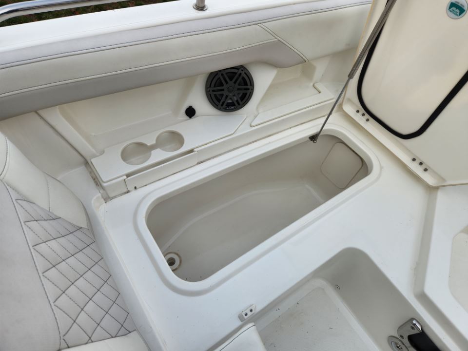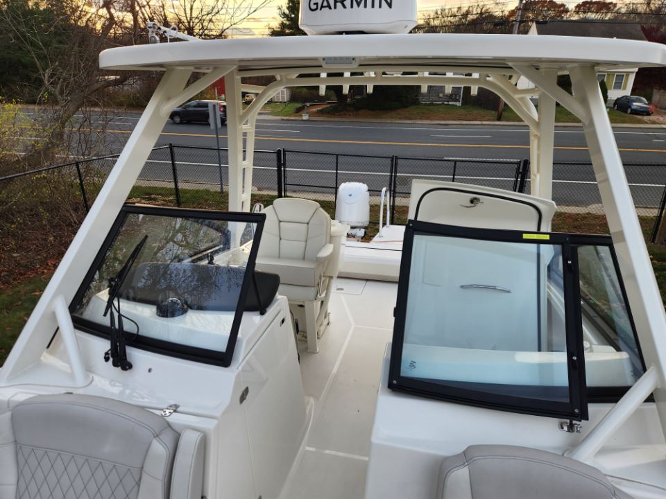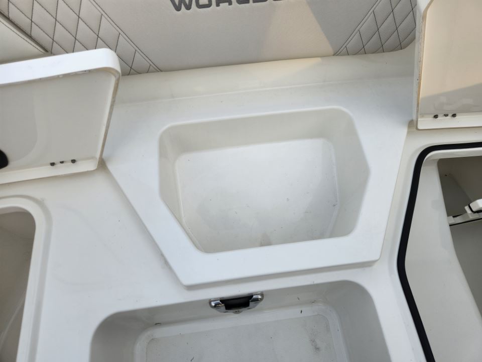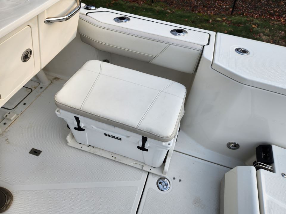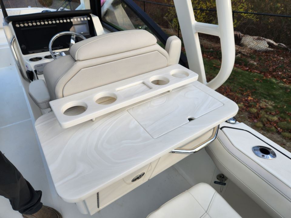 The cockpit is protected by a wraparound windscreen and a solidly built rigid hardtop with rod holders at the rear. There are multiple storage lockers, a live well, and a clever swing-out cooler that provides additional seating or a step when in use, and stows beneath the helm seat when not. The port helm-seat backrest swings fore and aft to allow for forward- or aft-facing seating. At the transom, a fold-down backrest creates either a bench seat or an open walkway to the sturdy aluminum tubular swim ladder.